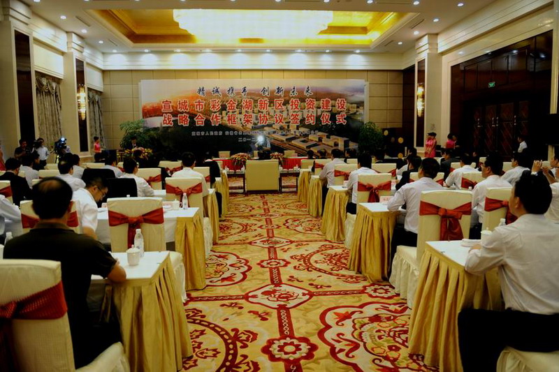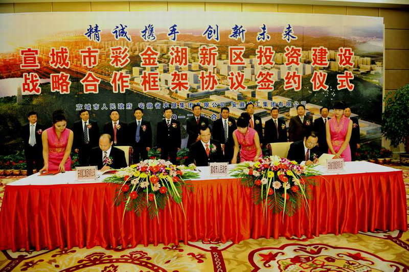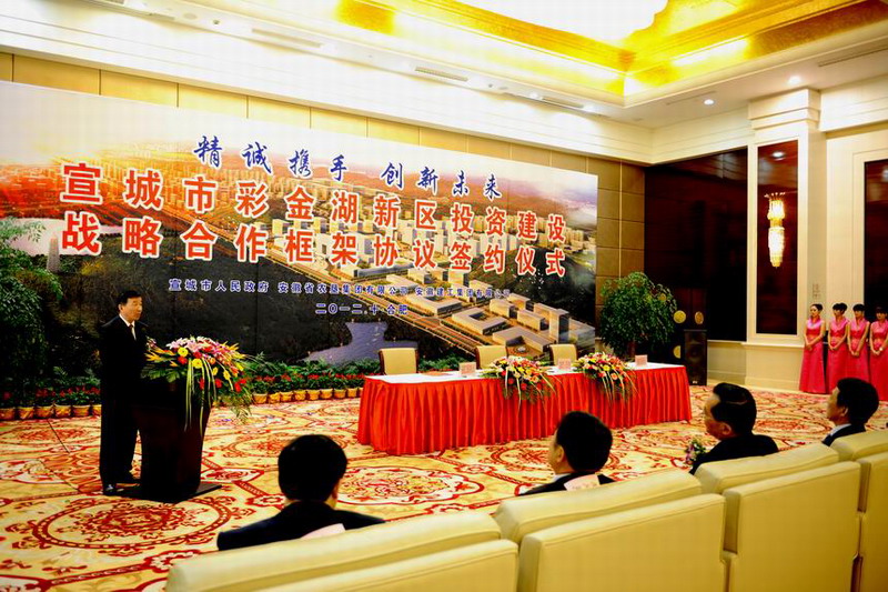 宣城市委书记童怀伟首先在致辞中向到会领导和来宾表示欢迎,对农垦集团、建工集团大力支持宣城市建设发展表示感谢。他说,建设彩金湖新区,是宣城市委、市政府立足长远发展作出的重大决策,对拉大城市框架、完善城市功能、改善人居环境、提升城市形象具有重要意义和作用。农垦集团和建工集团是实力雄厚、管理先进的大型国有企业,与两大集团合作建设新区,充分体现了三方互信,各方将本着“平等互利、优势互补、互相支持、共同发展”的原则,携手将项目建成优质工程、民心工程、和谐工程、共赢工程,把彩金湖新区建设成为环境优美、功能完善、设施先进、宜居宜业的现代生态新城。童怀伟要求,市委、市政府及市直各职能部门,要切实承担起各项责任和义务,创造最优良的发展环境,提供最高效的服务保障,力争实现彩金湖新区建设“三年成势、五年成形、八年成城”的目标。