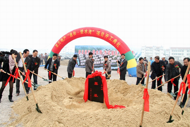 在喜庆的鞭炮声中,各位领导和嘉宾共同为通和·碧水湾房产项目工程挥锹奠基。(李峰)