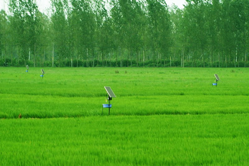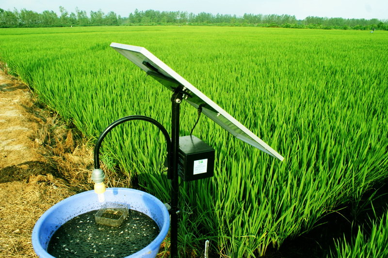 为减少农田农药投入量,保护农业生态环境,今年,安徽农垦大圹圩农场借助农机补贴项目,积极推广运用杀虫灯生态灭虫,取得较好效果。当前正值水稻病虫害防治关键时期,设置在农场水稻高产试验示范区内的一盏盏太阳能杀虫灯,成了杀灭水稻害虫的好帮手。每到夜晚,这些白天蓄足了能量的杀虫灯,如点点繁星在绿苗丛中散发着光源,诱使成千上万只害虫趋之若鹜,纷纷落网就擒。据农技人员介绍,高峰时每盏杀虫灯一晚上能诱杀害虫500克左右。