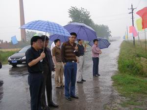 (图为,验收组的领导和专家们冒雨深入农场项目 区进行验收。)